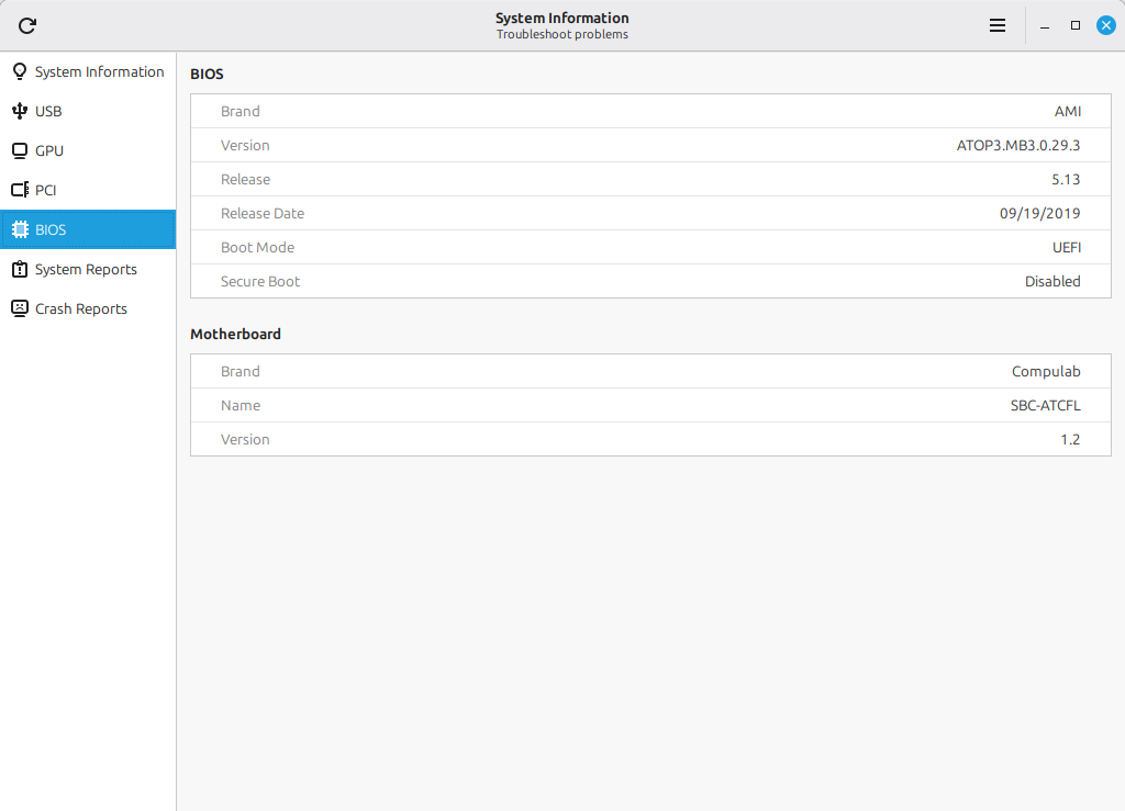 In the “BIOS” page you can find information about your motherboard, BIOS version, boot mode and Secure Boot.